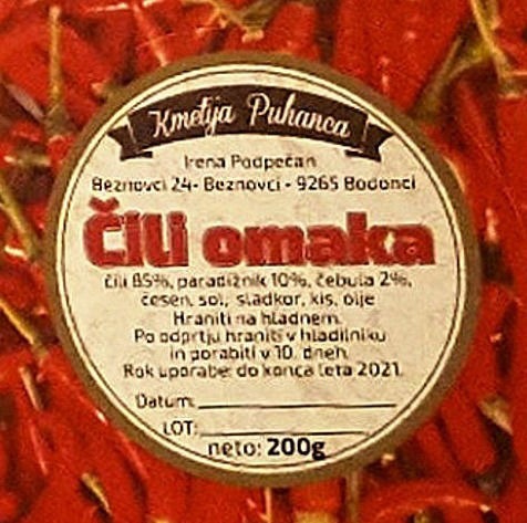 Vsi naši pridelki in izdelki, ki so embalirani, so opremljeni z nalepkami z našo oznako. Nalepka identificira proizvajalca, vsebino, količino, datum izdelave in rok uporabnosti. Za zdravo prehrano je obvezno spoštovanje načina hrambe in roka uporabe, ki sta posebej navedena na nalepki.